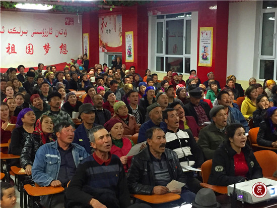 每天晚上9点整,在村委会的大会议室内就坐满了村民,“访惠聚”工作队队员一字一句带着村民读、唱、背国歌。