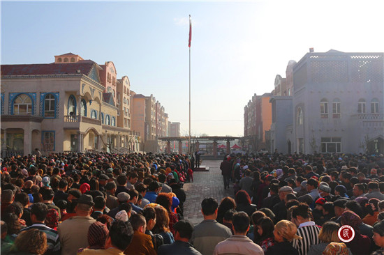新疆民生网讯 (通讯员 石胜聪)4月1日起《新疆维吾尔自治区去极端化条例》正式实施,为使辖区广大居民对《条例》入脑入心,进一步有效遏制和消除宗教极端化,实现社区稳定和长治久安。4月10日上午,拜城县拜城镇热斯坦社区利用周一升国旗仪式向居民进行深入宣讲。