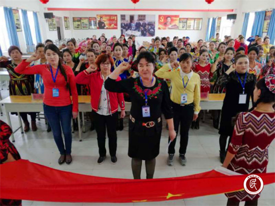 在工作队队长、第一书记的带领下,积极组织全体妇女同胞集中学习《新疆维吾尔自治区去极端化条例》、温宿县委副书记、县长包尔汗·买买提同志的《致维吾尔族同胞的公开信》,最后在妇女主任的带领下全体妇女同胞们进行了集体发声亮剑。其中,村妇女主任率先领誓发言:“我宣誓,我将始终忠于中国共产党、忠于国家、忠于人民、忠于宪法和法律,自觉维护民族团结,主动同‘三股势力’作坚决斗争,敢于发声亮剑、敢于主动作为、敢于责任担当,为实现新疆社会稳定和长治久安总目标而贡献力量!”。一百余名美丽的古丽们许下了铮铮誓言。