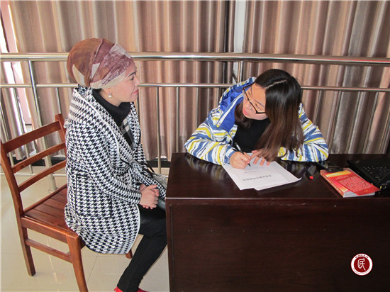时间来到3月20日,一位维吾尔族妇女早早来到犁铧尖社区,经工作队询问得知,她叫古丽努尔·阿卜杜热和曼,家住犁铧尖社区上新巷16号,离异,目前独自抚养2个孩子上学,家庭经济较为困难,想急需找一份稳定的工作。
