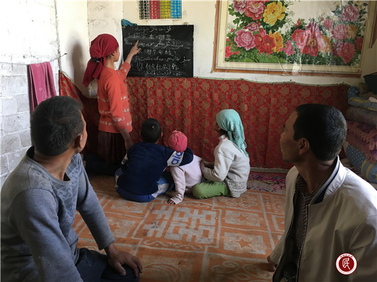英巴格村紧邻多浪河二期,典型的城乡结合部。村民大多时候除种地外还有很多人到城市打工或者市场上贩卖自家种植的蔬菜。很多村民都说以前想学汉语,但苦于没有专门的人来教,只能通过平时打工卖菜或者其他机会来自己慢慢学习一些日常用语。但这样学的很片面,且学习的正确与否也不能保证。双语课开始后,村民热情高涨,不仅上课时认真去学,课程结束后回家还在学习。这不,工作队今天晚上入户走访就发现艾合买提·热合曼一家正在由上初中的大女儿教弟弟妹妹和父母一起学习双语。我们的村干部艾尔肯同志也跟着“小老师”听了一节课。艾合买提·热合曼告诉我们,他发现现在的社会懂得双语的人更容易找到工作,双语都不懂得很有可能被淘汰,那就一辈子只能生活在新疆农村的小圈子里。所以他不仅让自家儿女学双语,自己和妻子也跟着孩子学,督促孩子一起学。
