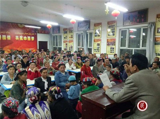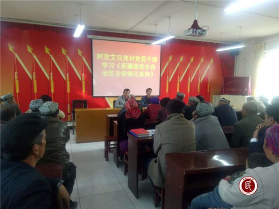 村党支部书记麦麦提·肉素力说:“宣传《新疆维吾尔自治区去极端化条例》、《致维吾尔族同胞觉醒书》是非常重要的,首先让村民通过学习能有正确的辨别是非能力;其次,《新疆维吾尔自治区去极端化条例》的出台和实施将使我们的去极端化工作步入良性法律运作轨道,为实现新疆的社会稳定和长治久安作出更大的贡献。”