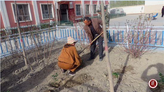 工作队副队长刘淑云看到博斯坦村绿化带无防护栏,绿化亮化环境较为落后,积极和县领导沟通,协商解决了绿化带防护栏问题。工作队队长麦麦提.吐尔逊自己出钱为村委会买了树苗和花卉,并带领全体工作队员和村委会干部共同在村委会大院内植树种草,绿化环境。