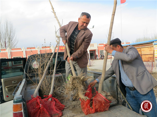 (工作队队长麦麦提.吐尔逊自己出钱给村委会买树苗)