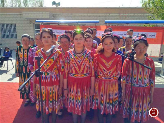 伴奏响起,激昂嘹亮的国歌声在现场响起,整齐的队形、穿艾德莱斯裙子和戴花帽的妇女和穿西装的男士们,精神饱满、神情投入,展现出了积极向上的风貌,歌声整齐、嘹亮,唱出了国歌的气势,唱出了激情,表达了对祖国无限热爱和对未来美好生活的憧憬。观看的村民们无不为精彩的表演所感染,掌声不断,台上台下融为一体,呈现出一片欢乐、祥和的气氛。