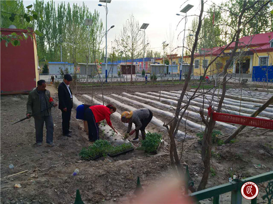 新疆民生网讯 (通讯员 邓红艳)又是一年好春光,天气回暖,草长莺飞。为进一步优化美化村级阵地环境,4月16日下午,克州民政局驻阿克陶镇央其买里村工作队与村干部一起抓住春季植苗播绿的有利时机,共同绿化美化村两委大院,对村容村貌进行改善。大伙积极搭建葡萄藤架,买来花种菜苗,种植花草蔬菜,到处是同志们忙碌的身影,有的松土刨坑,有的施肥,有的铺地膜,有的提水灌溉,种植的每一个步骤都做得认真细致,每个环节都衔接有序,配合默契,花草菜苗整齐的栽种到地里。