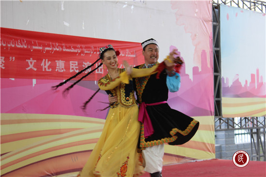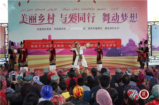新疆艺术剧院歌舞团的艺术家们带来了耳熟能详的歌曲,轻快有力的舞蹈。他们精彩的表演受到村民热烈的欢迎。观看演出时村民们时而欢呼、时而大笑、时而起立鼓掌、时而静静落泪。演出完毕村民们仍久久不愿离去,拉着演员的手激动地说着:“谢谢!”“你们表演的太好了!”“爱你们!”“你们以后还要来呀!”看着艺术家们亲切的笑脸,让人不得不赞叹:你们是真正走进人民心里的艺术家!