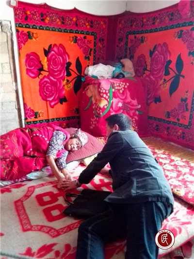 4月15日下午,工作队在入户走访中得知村民艾萨汗·乌贾乌拉生病的消息后,立即组织队员们购买了牛奶、水果和糕点等慰问品到大妈家进行看望。刚进屋门,映入眼帘的是一位极其瘦弱的大妈平躺在农家大炕上,身下垫着厚厚的棉被,口中不停的发出低沉的呻吟声,队员们和大妈家人打招呼后都走到炕前,工作队队长陶永寿轻轻地伏在大妈的枕边,握起她瘦如干柴的手:“大妈,很不舒服吗?我们是工作队的,知道您生病了都过来看看,希望您尽快好起来。”