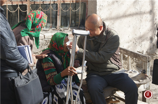 新疆民生网讯(通讯员 蔡怡)“我的老公已经去世了,家里就剩我一个老太婆了,是咱们工作队经常来给我送吃的用的。今天,又来给我送拐杖,我真的是太激动了,感谢共产党的关心和帮助,热合买提!热合买提!”今年71岁的老人坎吉汗·区肉克从第一书记、驻村工作队队长陈超勇书记手中接过新拐杖激动地说。4月16日,阿克苏地区食品药品监督管理局驻拜城县察尔齐镇巴扎村工作队根据坎吉汗·区肉克老人的身体状况,把从医疗器械厂家定制的一副拐杖第一时间送到了老人手中,为老人解决了日常生活中的诸多不便。