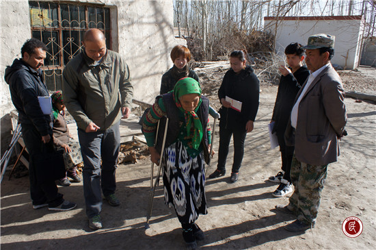 第一书记、工作队队长陈超勇在察尔齐镇巴扎村6小队走访入户时,得知坎吉汗·区肉克是一位孤寡老人,在加上年纪太大,平日里吃饭、行动都较为困难。了解情况后,工作队立即组织村委会召开了巴扎村扶贫帮困工作会议,决定把坎吉汗·区肉克老人等此类孤苦、无助的人员列为重点贫困户进行帮扶,并明确要求各小组认真摸排走访,摸清真实情况,制定详细的工作方案,明确帮扶人员、工作模式和帮扶效果,形成“一对一”、“多对一”的长效机制。并针对坎吉汗·区肉克老人的住房情况,决定先将老人的三间裂缝土墙瓦房纳入2017年第一批富民安居房。动员党员干部、驻村工作队员积极开展帮扶工作,有时间多看望老人、多问问老人想吃什么,家里需要什么,献出爱心,让老人老有所依,安享晚年。