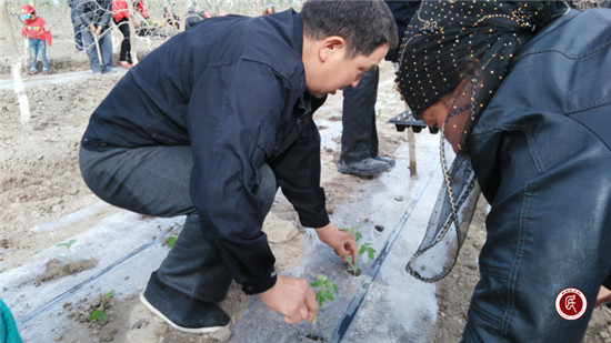 新疆民生网讯(通讯员 陈丽)4月17日,阿克苏市哈拉塔勒镇托万克萨提村“访惠聚”工作队紧紧围绕“1+2+5”工作目标任务,积极深入田间地头,及时了解掌握群众的困难诉求,为群众开拓致富门路,购买了1万株辣子、西红柿、茄子等蔬菜苗在红枣地里套种,努力解决村民生产生活中的实际困难,并现场进行技术指导、帮带和服务。