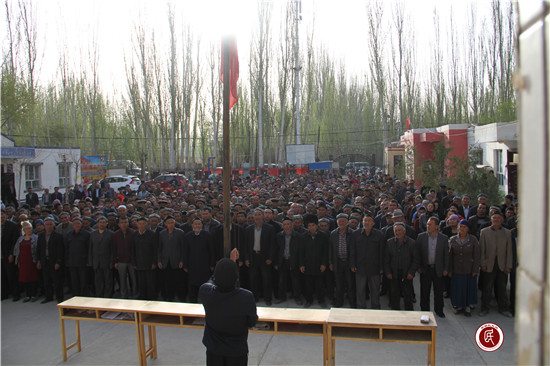 早晨九点半,村民们齐聚村委会大院举行升国旗仪式。升旗仪式结束后,驻村工作队长亚力坤·卡的尔代表工作队登台发声亮剑,表明立场做了《旗帜鲜明、坚定立场反对“三股势力”、巩固社会稳定的长城》的表态发言,表示一定要认真履行职责,团结凝聚人心,坚决同“三股势力”作斗争,用自己的实际行动捍卫祖国统一和民族团结,以和谐稳定的社会环境,迎接党的十九大胜利召开。接着村第一书记带领驻村工作队全体队员、村两委班子成员、寺管会干部、村警与全体村民面向国旗庄严宣誓:坚决拥护中国共产党的领导,时刻与党中央保持高度一致,面对大是大非,勇于发声、敢于亮剑,旗帜鲜明地与“三股势力”作斗争,以实际行动维护社会稳定和长治久安。随后大家在写有“乌恰村干部群众反恐维稳发声亮剑宣誓签名启动仪式”的横幅上依次签字。