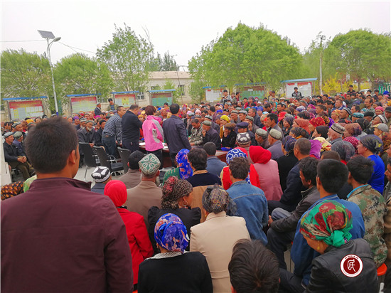 正当工作队员和村民们都听得津津有味时,谁知突然停电了,扩音设备不响了,面对几百双殷切的目光,工作队的同志们建议大家坐近点,村民们立即自觉地搬着凳子围绕着主席台紧紧地挨着坐下,形成了一个圈把主席台围在了中间,看到村民们这么热切,乡党委委员、组织干事亚森江·阿皮孜、村第一书记王新辉、驻村队员兼翻译艾斯卡尔·努尔同志纷纷受到感染,都站了起来提高嗓音给大家一直讲了二个小时,期间村民们不时发出阵阵热烈的掌声。