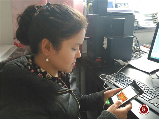 驻村工作队队员正在通过手机微信平台学习自治区党委九届二次全体(扩大)会议内容