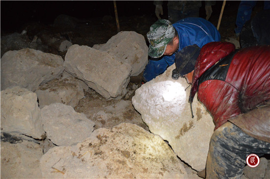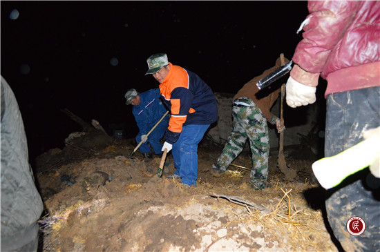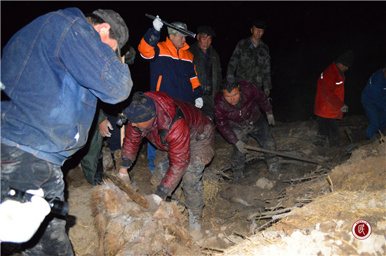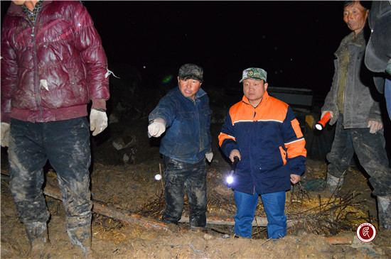 在受灾现场,近100平米的棚圈完全倒塌,由于灾情发生较快,牧民没有来得及疏散在棚圈里的羊群,坍塌的墙体及棚顶造成三十多只大羊死亡。驻村工作队和村干部在稳定受灾群众情绪、仔细勘察现场后,立即组织救灾工作。天灾无情人有情,在驻村工作队队长仝新峰统一指挥下,驻村工作队队员、村干部和村民十余人团结一心,众志成城,全力投入到救灾工作中。虽然深夜里能见度很低,雨一直在下,但并没有影响大家救灾的热情,大家齐心协力,分工明确,有拿手电的,有拿撬杠的、有拿铁锹的,在保证安全的情况下,奋力从倒塌的棚圈中扒出牲畜,力争将损失降到最低。