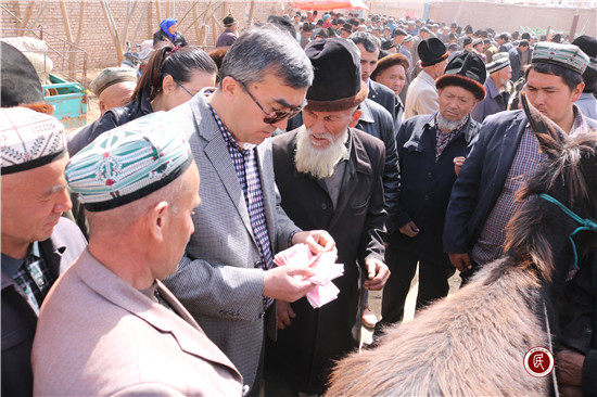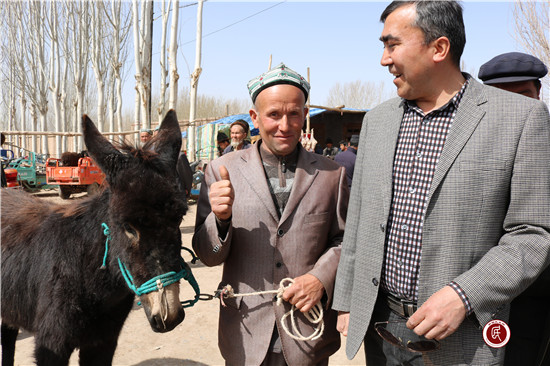 新疆民生网讯 (通讯员 温雪飞 )热闹的牛羊巴扎上,喀什大学驻阿克喀什乡库勒(1)村工作队副队长亚力坤和村民苏皮·艾力木正在挑选一头合适的毛驴,几经讨价还价,最终以5750元的价格成交,苏皮·艾力木激动地握着亚力坤的手说:“这让我该如何感谢你,感谢工作队,我一定会好好利用这头毛驴,供我的三个孩子读书,将来也能做一个帮助别人的人!”