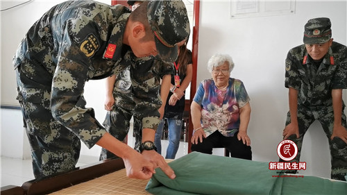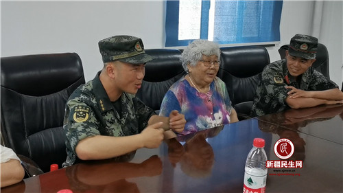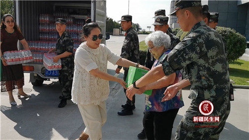 新疆民生网(刘妍琛)东彩社区有一位80岁的老奶奶名叫冯益英,从1989年开始拥军至今已经坚持了30年,对她来说每一位军人都是她的兵儿子,几十年来她为兵儿子们熬夜缝制近万双鞋垫、冒雪送去热腾腾的年夜饭,每年“八一”建军节前夕都会带慰问品去看望她的兵儿子们,今年也不例外。2019年7月26日上午,冯益英奶奶在东彩社区书记罗永艳和退伍军人张旭东的陪同下,共同携100件矿泉水、20件饮料、1麻袋西瓜,慰问克拉玛依市武警支队警勤中队官兵。