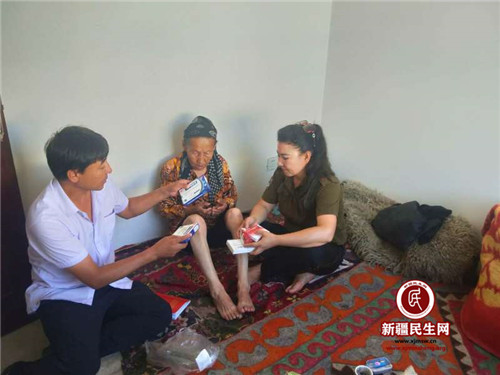 新疆民生网(夏静)“夏尔汗大妈,你最近身体怎么样了?”“艾老师,我好些了,有时候晚上还是睡不好。”“这是这个月的药,你要按时吃,您也不要在抽烟了,对身体不好。”“好的,知道了,谢谢你。”这样的对话基本上每个月都会在工作队副队长艾麦提和夏尔汗大妈之间发生。
