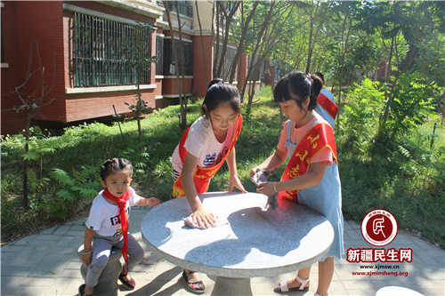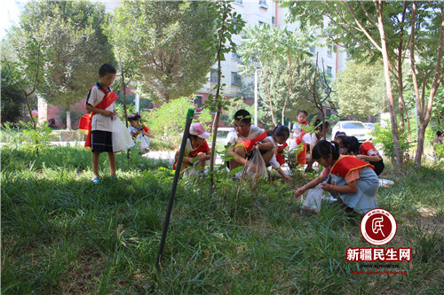 新疆民生网(南淼) 为加强辖区学生管理,丰富暑期社会实践生活,提升学生爱护环境卫生的社会责任感。7月27日,米东区税务局驻米东南路片区管委会同心社区工作队联合同心社区开展“爱护环境卫生,争做环保小能手”欢乐暑期系列活动,组织辖区50余名中小学生清扫社区街道、林带、广场上的杂物。