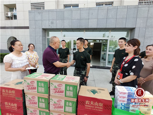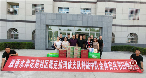 新疆民生网(古丽米娜)他们是钢铁的城墙,他们是和平的保障,他们是可敬的人们,他们是祖国的脊梁。为纪念中国人民解放军建军92周年,继续做好新形势下社区的双拥工作,加强森香水岸社区与克拉玛依武警支队的和谐共建。7月29日下午,森香水岸社区“两委”班子对克拉玛依武警支队进行了慰问,为广大武警官兵带去饮用水、日用品等慰问品。社区第一书记、工作队队长吾买尔江· 买买提代表社区全体人员向武警官兵们送上了节日的祝福。